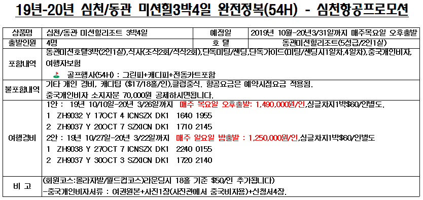 2019~20 심천미션힐/동관 3박4일 54H - 심천항공 골프여행