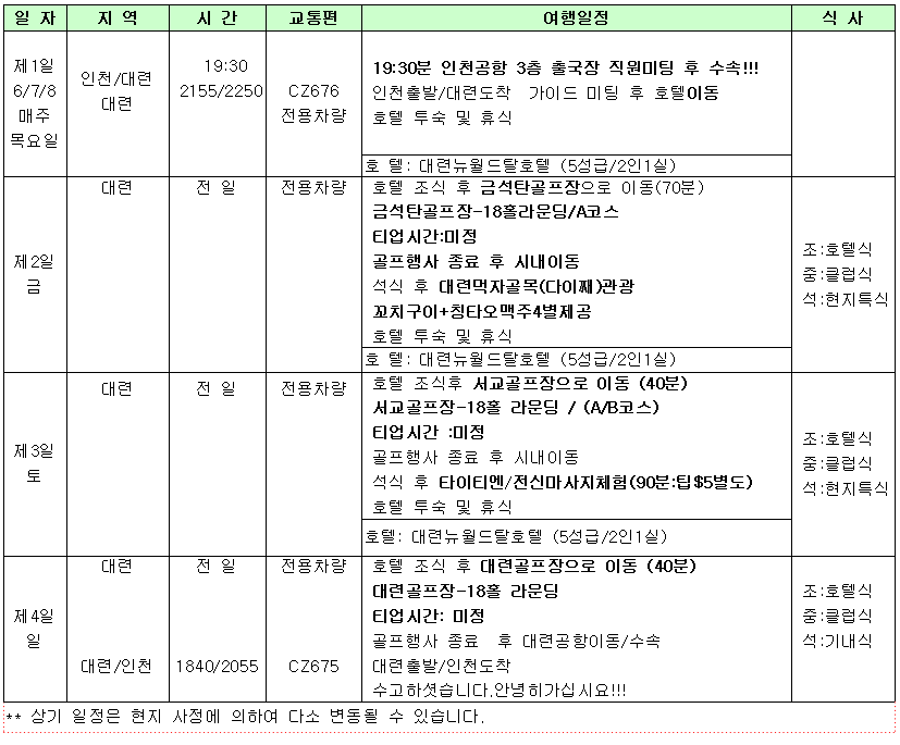 대련 골프투어 3박4일 54홀(남방항공 스케쥴 기준)